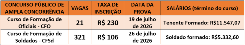 Para o concurso do CFO 2027, será exigido a titulação de nível superior de escolaridade, na modalidade de bacharelado ou de licenciatura, ou seja, não há restrição de curso. Já para o CFSd 2027, será exigido a titulação de nível superior de escolaridade, sendo o curso superior bacharelado, licenciatura, tecnólogo ou sequencial.